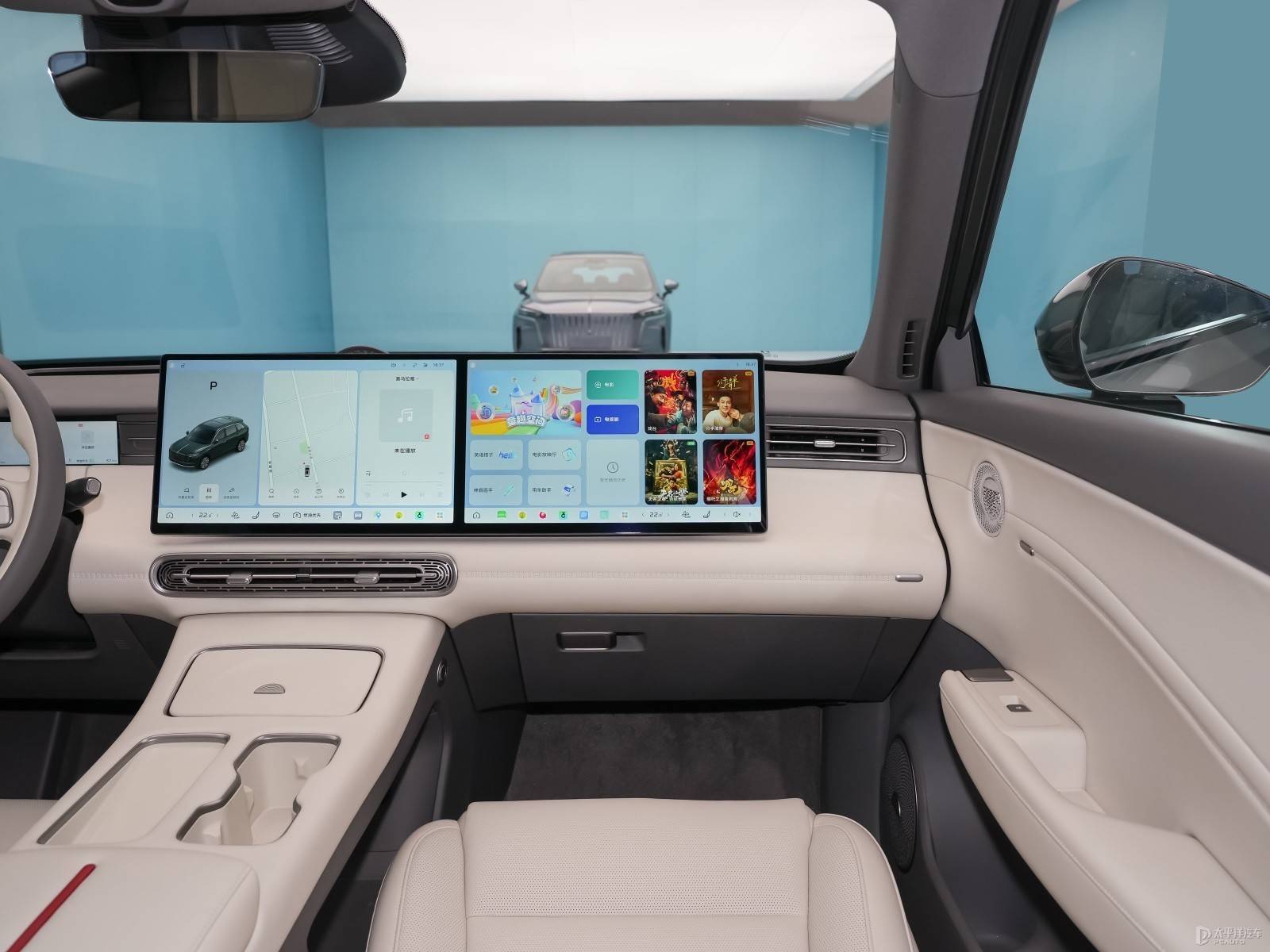 内饰部分,红旗HS6 PHEV采用了全新的设计,最引人注目的是副驾驶侧双联屏,配合液晶仪表盘和HUD抬头显示组成多屏联动。