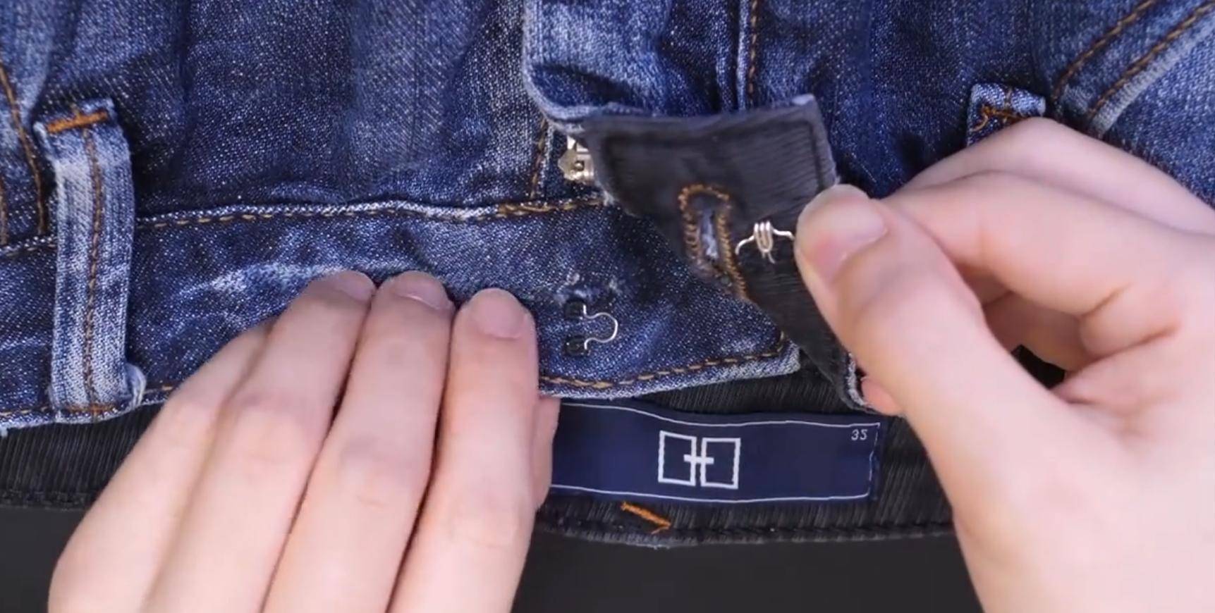 这时就可以把文胸上面剪下来的挂钩,分别用针线缝在裤子的两端,然后再把挂钩扣好,一条废掉的裤子就修复完成,省下买裤子的钱,全家人买几斤排骨吃不香吗?