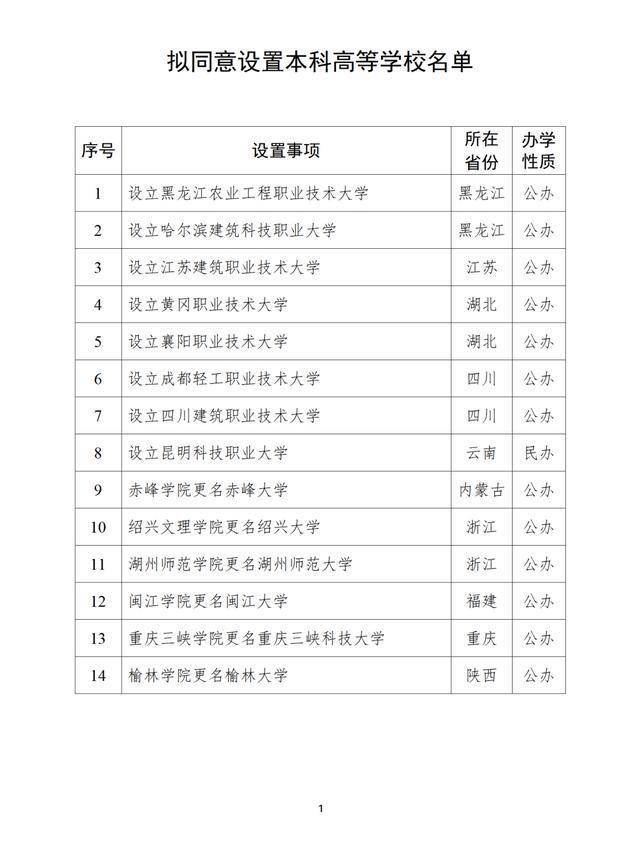 1月12日,教育部发布《关于拟同意设置本科高等学校的公示》。根据《中华人民共和国高等教育法》《普通高等学校设置暂行条例》《普通本科学校设置暂行规定》《本科层次职业学校设置标准(试行)》等有关规定,经教育部党组会议审议,拟同意设置黑龙江农业工程职业技术大学等14所学校,现予公示。